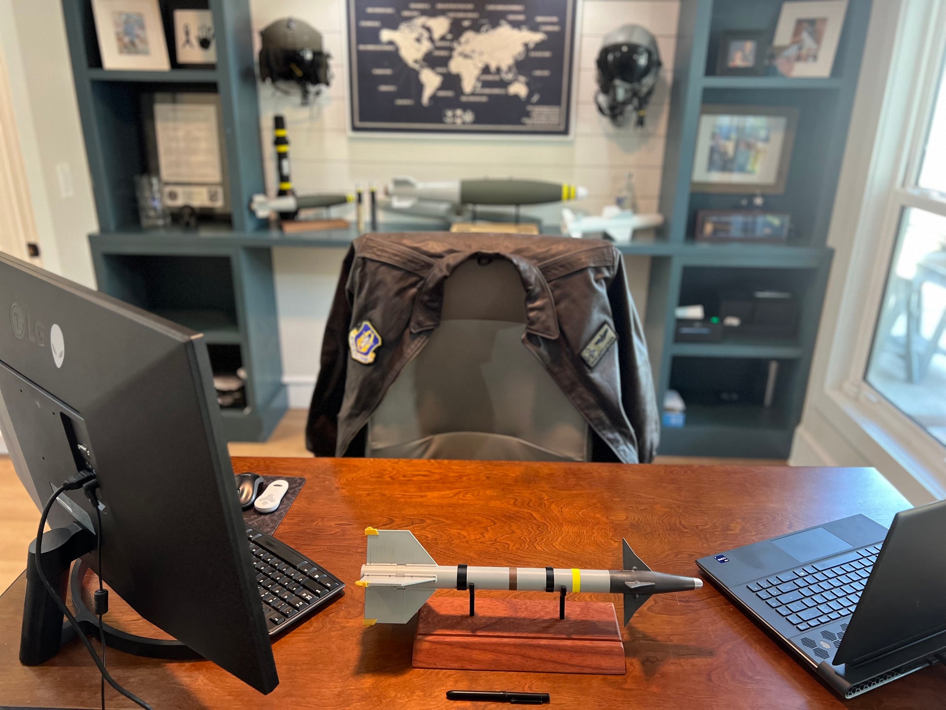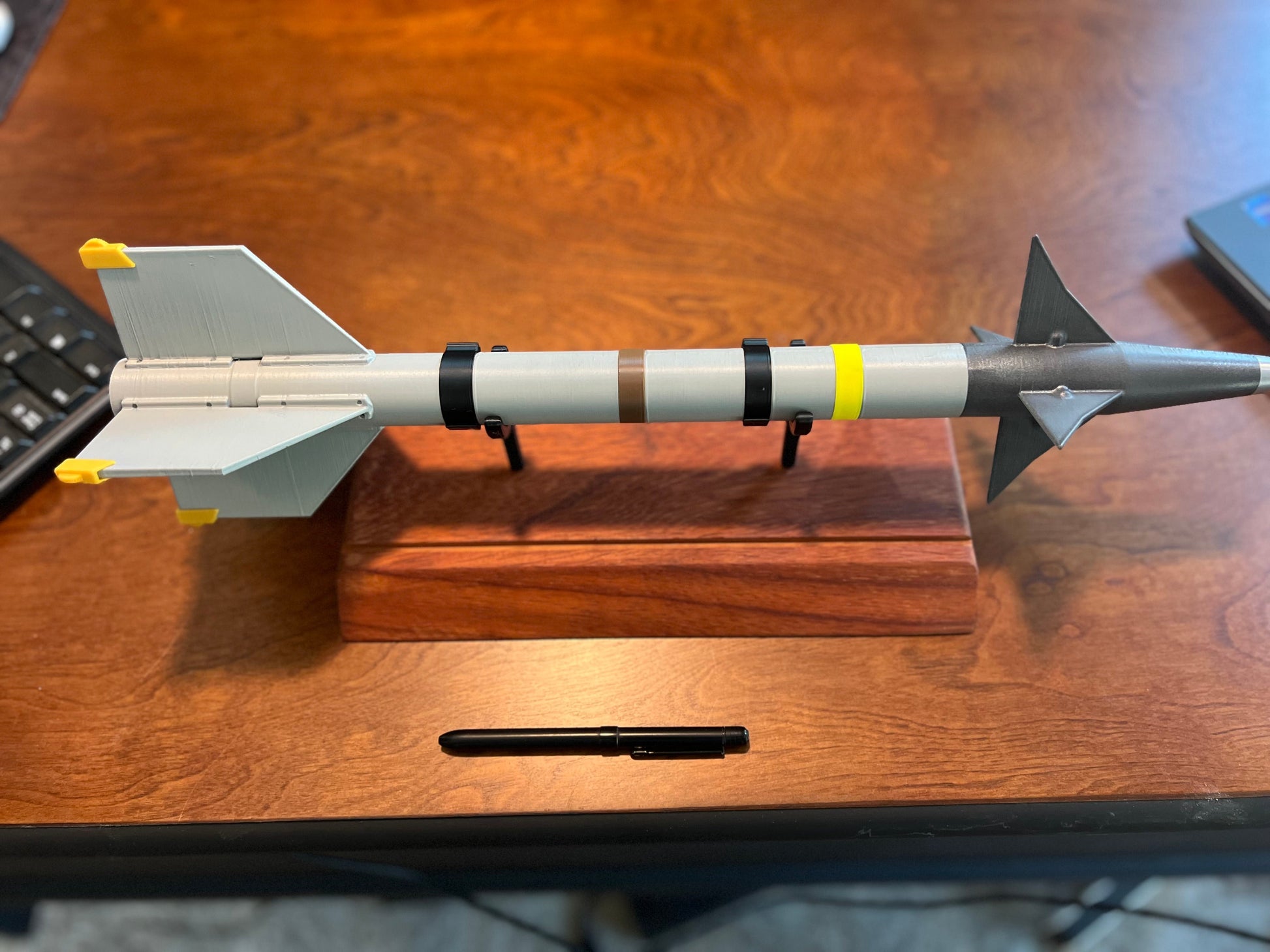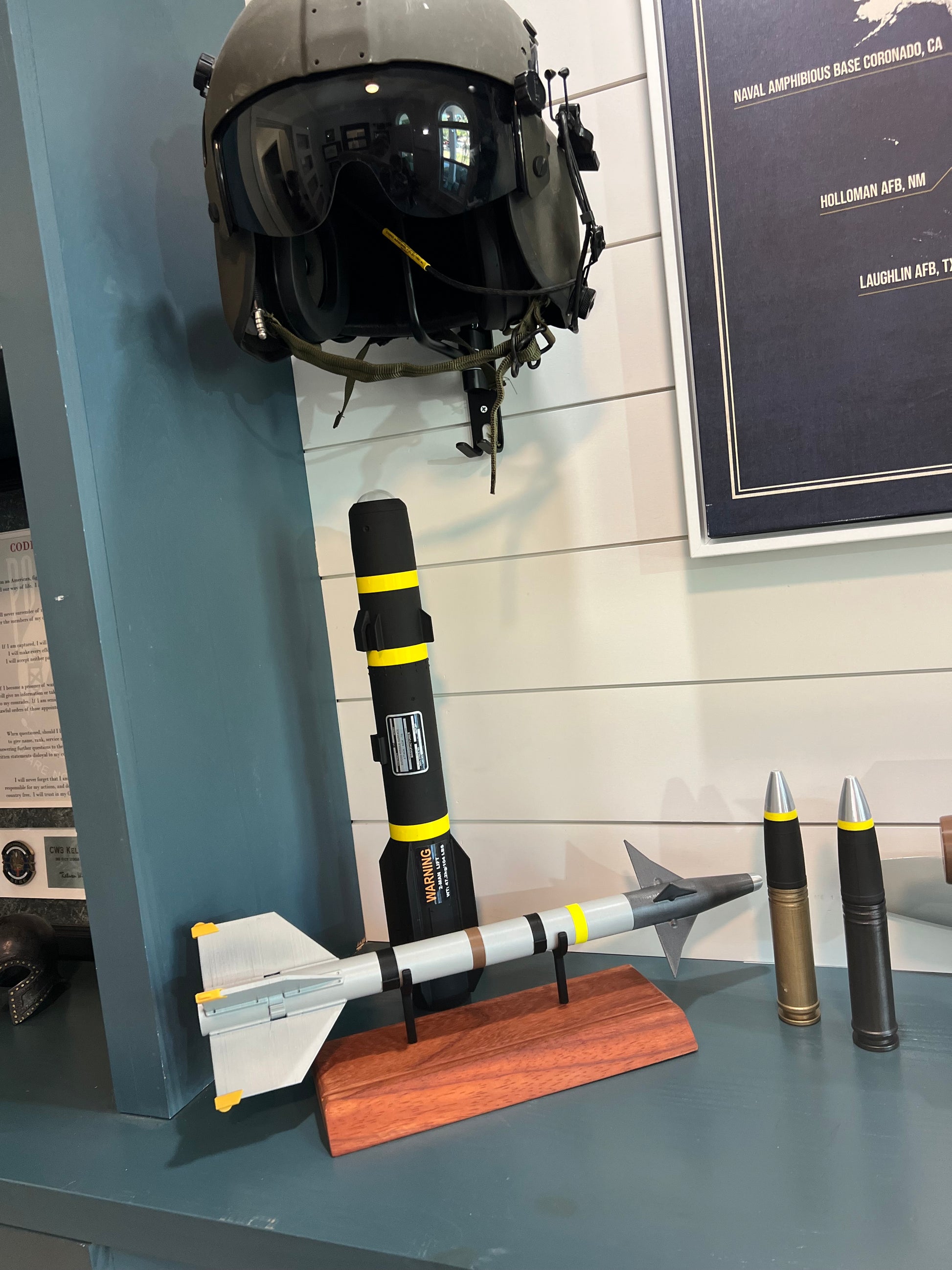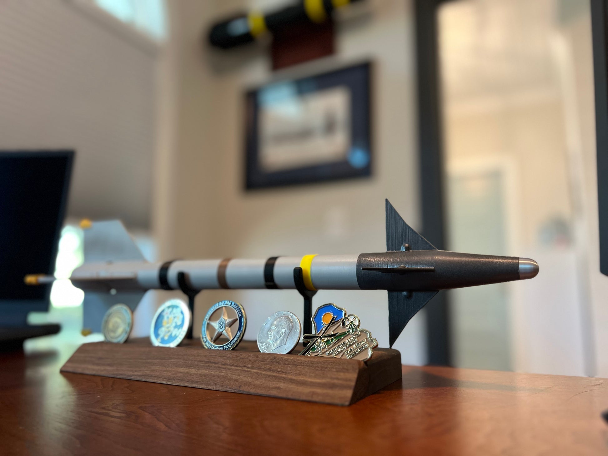 Approx. 18" tall by 2" diameter (main body) personally designed by our staff, modeled after the Aim 9 missile. This model is 3-D printed with industry leading PLA+ and hand-painted with gloss and metallic paint. The main body can separate into two halves for ease of shipping and storage of small items i.e. cigars. Wooden Base and stands are included. Please select from the list at the top of the page.