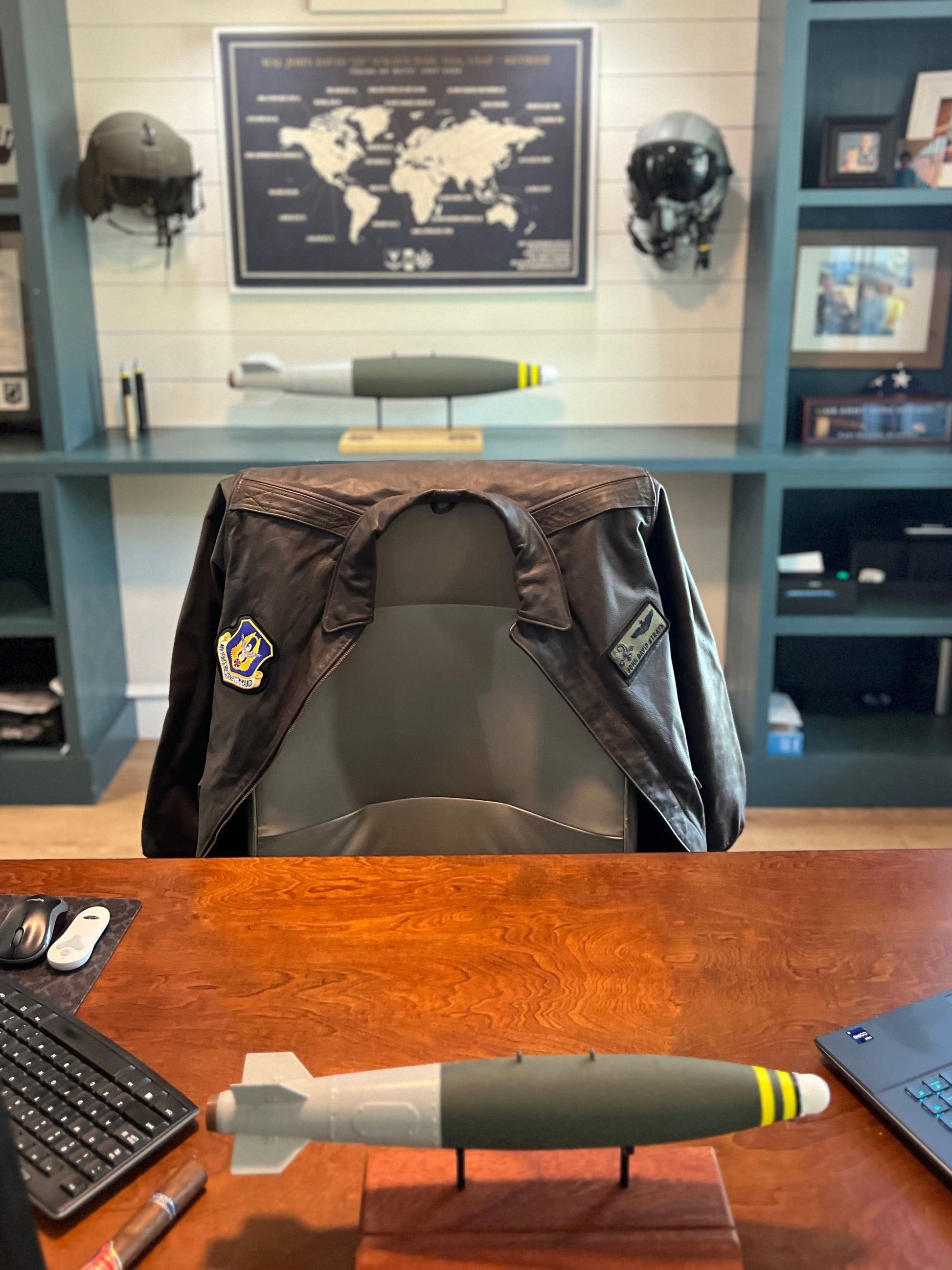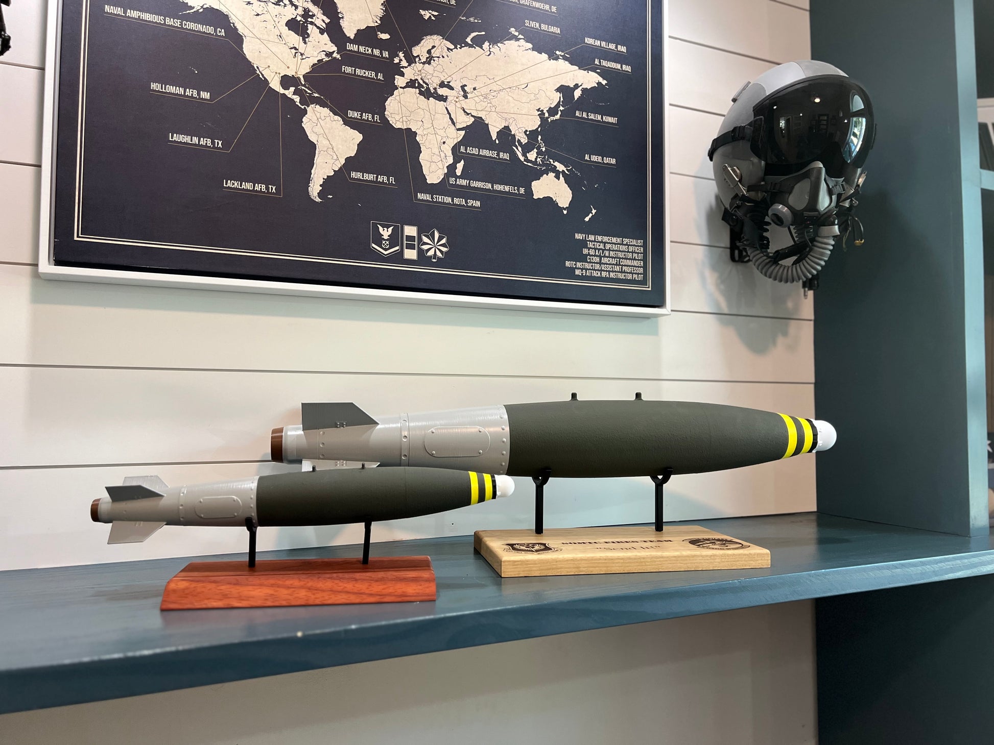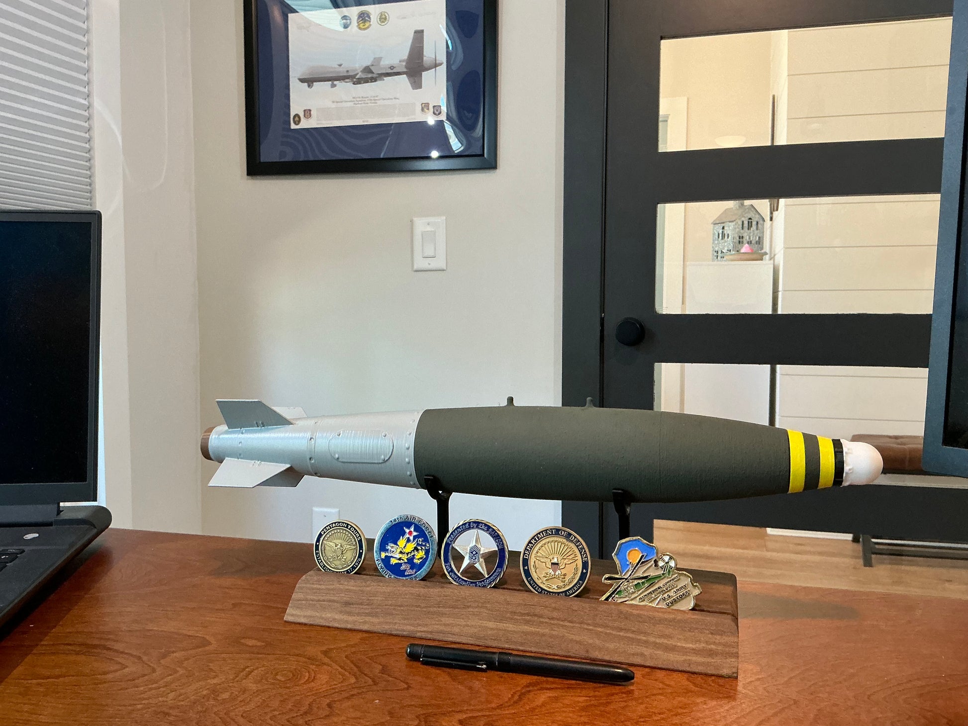 Approx. 18" tall by 3" diameter (main body) personally designed by our staff, modeled after the GBU 38. This model is 3-D printed with industry leading PLA+ and hand painted with a flat black, and flat green paint. The main body can separate into two halves for ease of shipping and storage of small items i.e. cigars. Wooden Base and stands are included. Please select from the list at the top of the page.